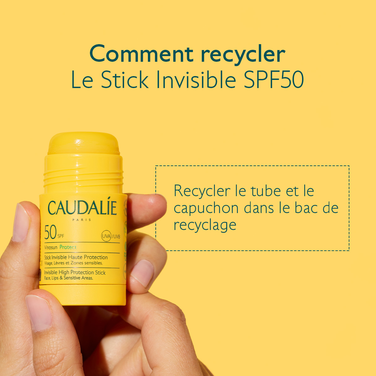 | Le saviez-vous ? | Caudalie collecte dans l’océan et recycle autant de déchets plastiques que la marque en utilise*. 1710 tonnes de plastique ont été récoltés et recyclés depuis 2020. Le Stick Invisible Haute Protection est recyclable en France** |
